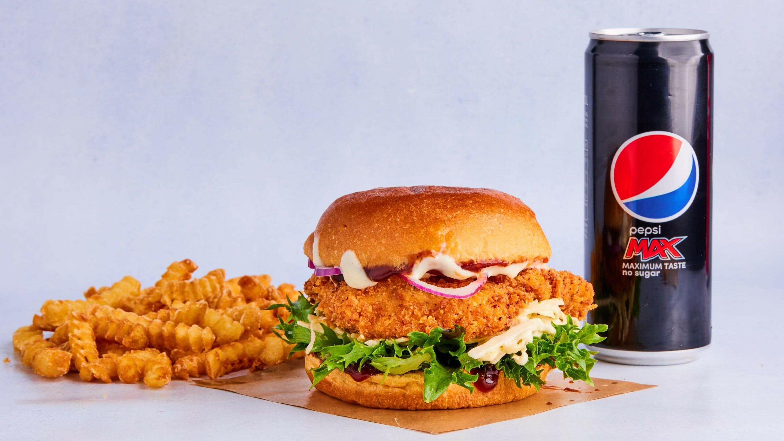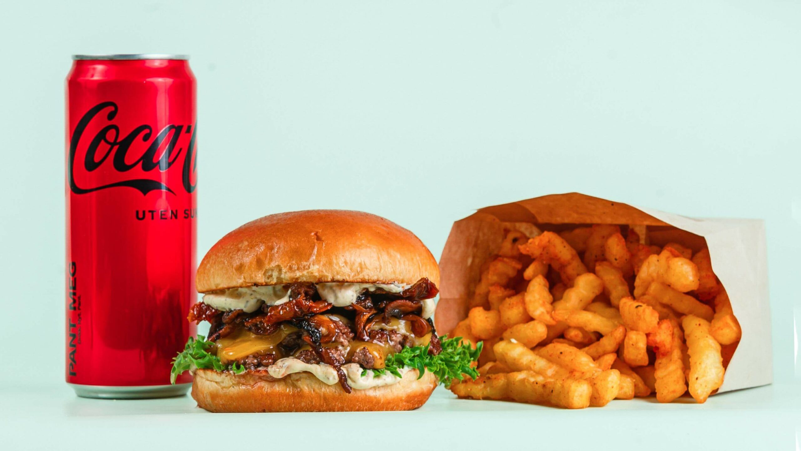 Béarnaisemayo, sun-dried tomato, caramelised onions with chili and mushrooms & crisp lettuce. The deal includes riffle cut fries & soda